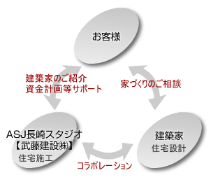 一生の住処となる大切なマイホーム。皆さまはどのような夢をお持ちですか? 「他にはない個性的なデザインの家」「環境にやさしい自然素材の家」「安心して暮らせるバリアフリーの家」…。 家づくりにかける様々な想いを私たちがお伺いしたうえで、日本全国のASJ登録建築家の中から、最もふさわしい建築 家をご紹介いたします。屋根の色から家具一つに至るまで、納得のいくまでじっくりと建築家にご相談し、夢の設計図を 完成させてください。私たちの施工技術で実現いたします。スタジオではイベントも随時開催しておりますので、ぜひ一度 足をお運びください。皆さまのお越しを心よりお待ちしております。